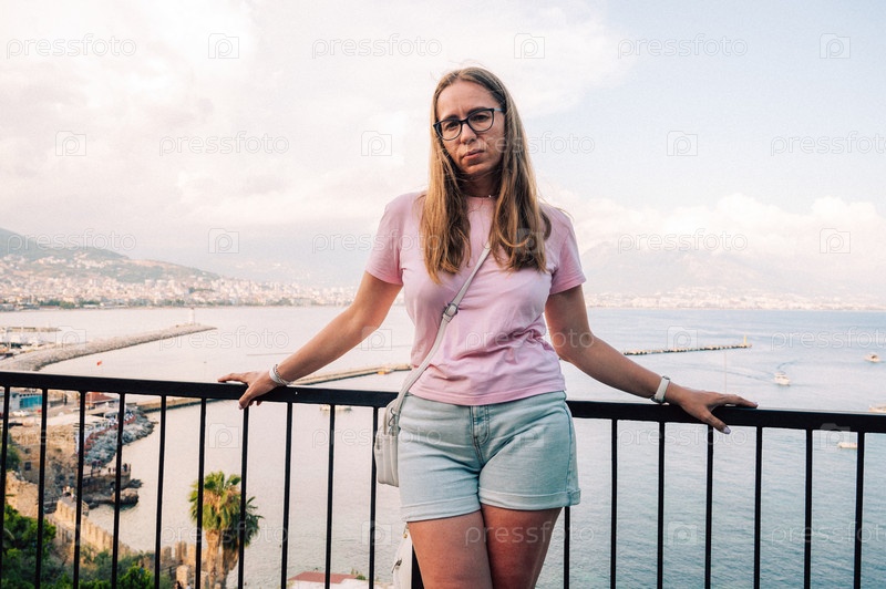 Женщина в руинах исторической Красной башни - Красная Башня в замке Аланьи.Красная башня является символом города Алания и известным туристическим местом Турции (Turkiye)
