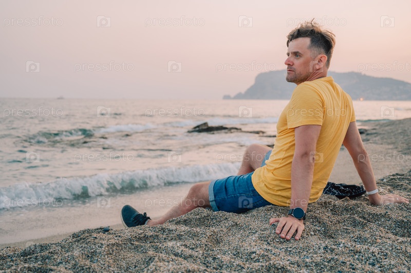 Мужчина сидит на пляже и смотрит на море в городе Алания
