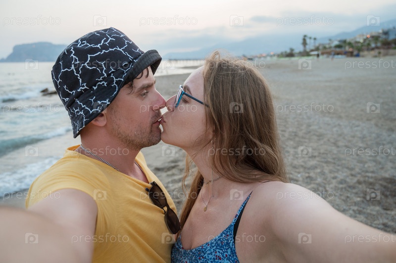 Счастливая пара фотографируется на пляже