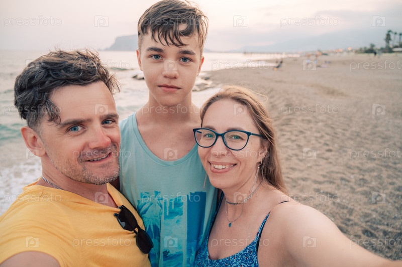Счастливая семья фотографируется на пляже у моря в городе Алания, Турция. Концепция путешествия или отпуска