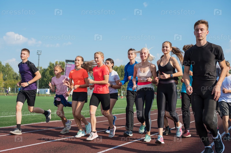 Группа юных спортсменов тренируется на стадионе. Школьные физкультурные тренировки или легкая атлетика