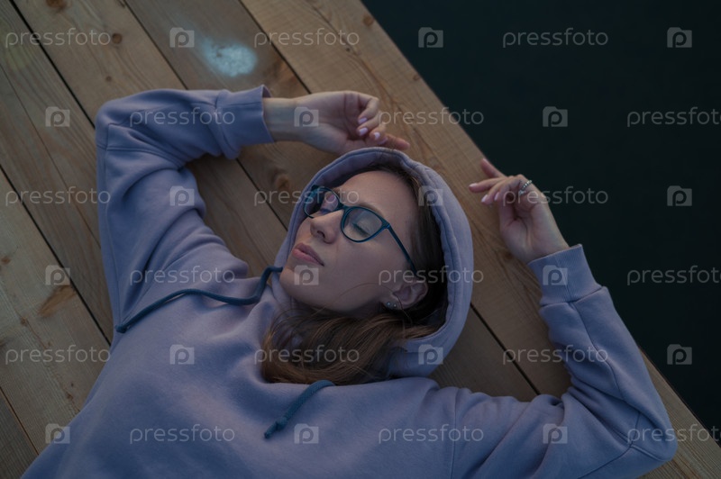 Женщина лежит на пирсе у озера, портрет крупным планом, летний закат