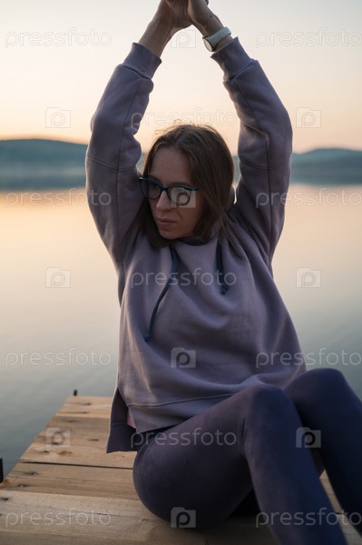Женщина, сидящая на пирсе, портрет крупным планом, летний закат