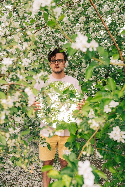 Творческий мужской портрет с зеркалом в весеннем саду цветущих яблок