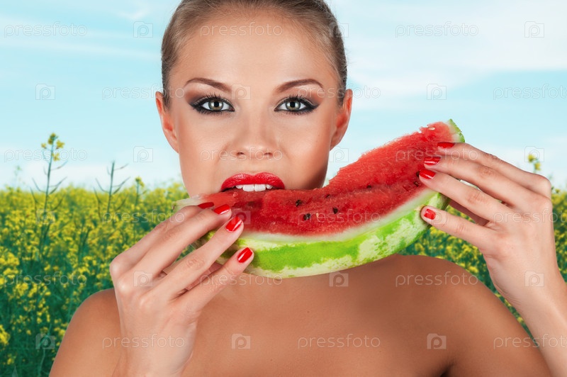 Девушка держит кусочек арбуза на зеленом и желтом летнем фоне