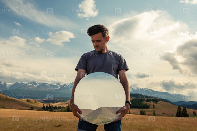 Мужчина стоит летом в горах Алтая в Курайской степи и держит круглое зеркало. Креативная концепция путешествия