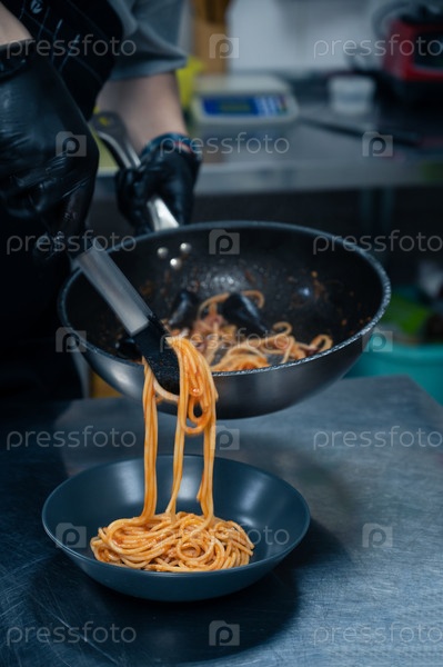 Шеф-повар готовит пасту из морепродуктов с мидиями с базиликом и помидорами в черной тарелке