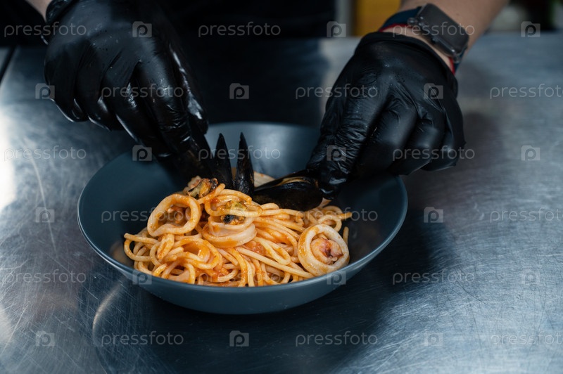 Паста из морепродуктов от шеф-повара с мидиями, базиликом и помидорами