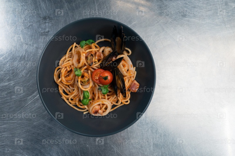 Паста из морепродуктов с мидиями с базиликом и помидорами в черной тарелке