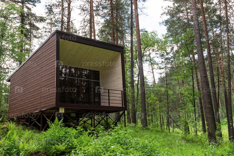 Дом или гостиница с панорамными окнами в сосновом лесу