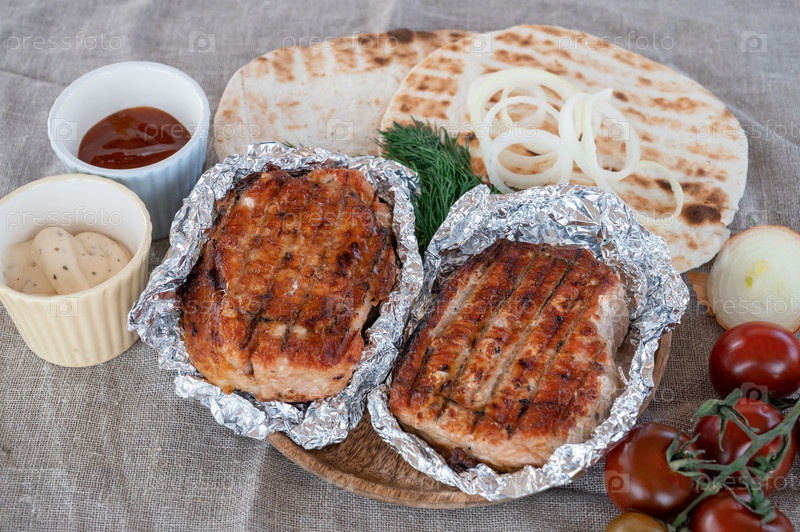 Жареная свинина в фольге с оладьями и овощами. Концепция летнего отдыха