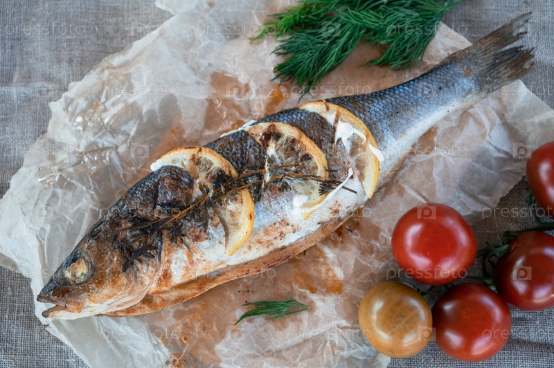 Аппетитная рыба сибас с зеленью и овощами. На деревянном фоне