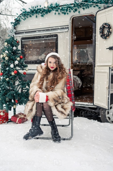 Молодая женщина в шубе в зимнем лагере