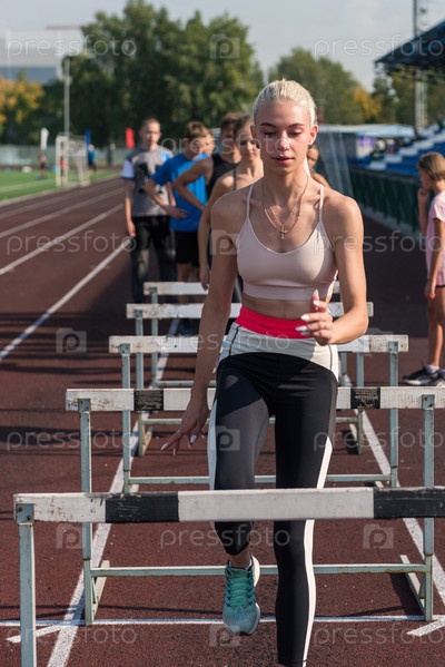 Молодая спортсменка-бегунья преодолевает препятствия
