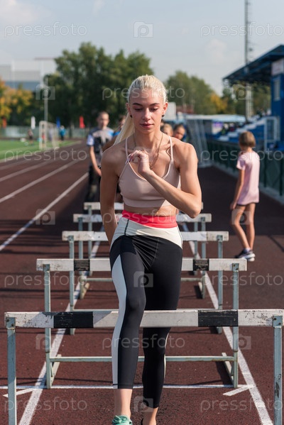 Молодая спортсменка-бегунья тренируется с препятствиями на стадионе на открытом воздухе