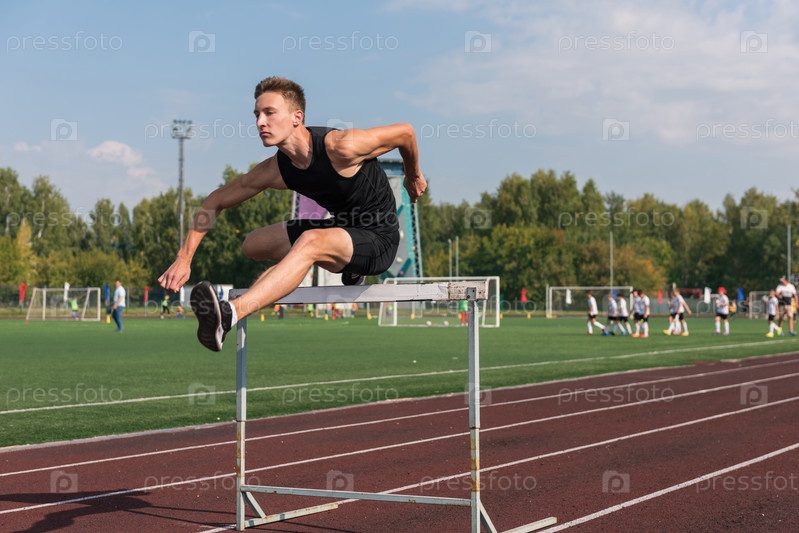 Молодой человек-спортсмен бегун бегает с препятствиями на стадионе на открытом воздухе