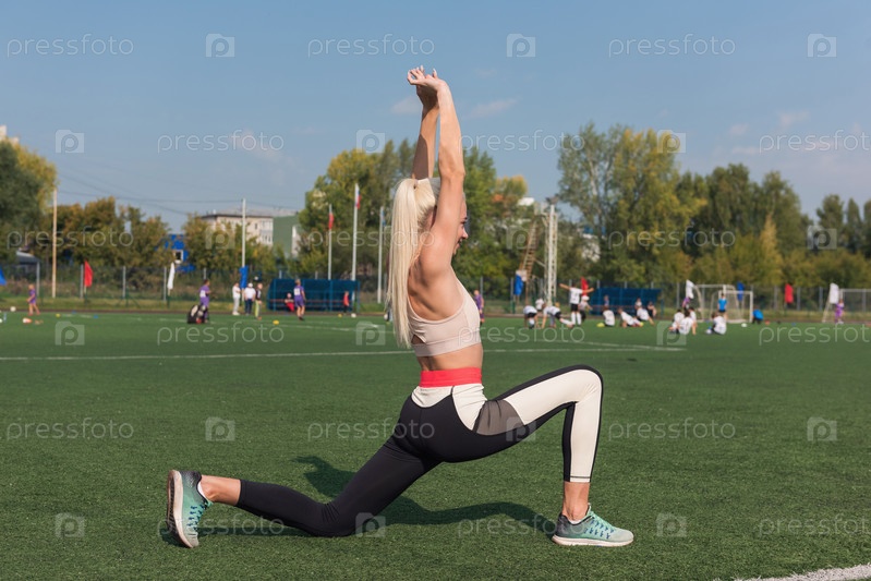 Молодая спортивная женщина в спортивной одежде растягивается на стадионе