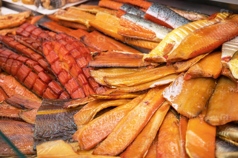 Различные копченые рыбные продукты. Концепция здорового питания и рыбного рынка