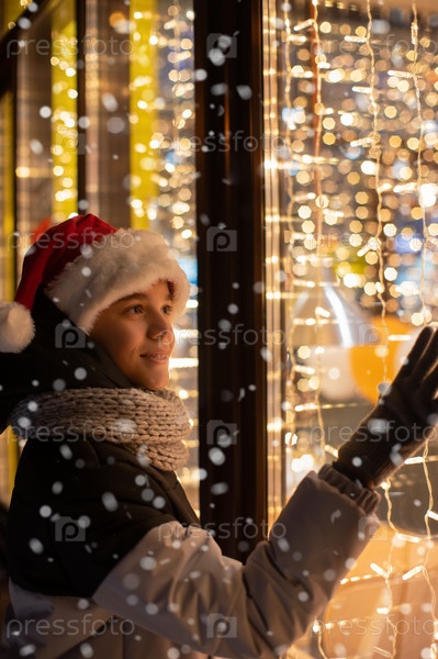 Мальчик в шляпе Санты смотрит и мечтает в освещенной витрине. Рождество представляет праздники или покупки на Новый год или Рождество