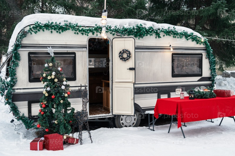 Дом на колесах Campervan в зимнем кемпинге, украшенный к Рождеству или Новому году