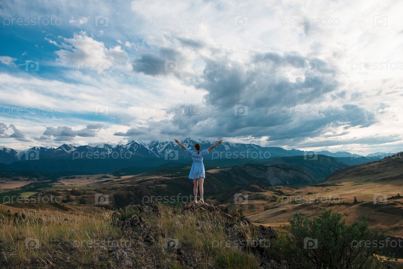 Женщина в синем платье летом в горах Алтая в Курайской степи