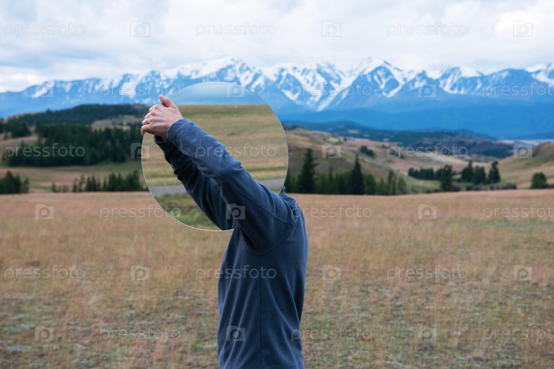 Мужчина стоит летом в горах Алтая в Курайской степи и держит круглое зеркало. Креативная концепция путешествия