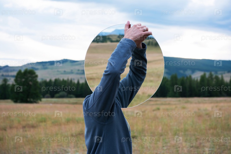 Мужчина стоит летом в горах Алтая в Курайской степи и держит круглое зеркало. Креативная концепция путешествия