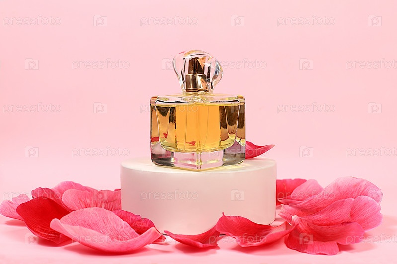 Спа и оздоровительная композиция, ароматные духи и лепестки пиона и розы на светлом фоне, приглашение и реклама салона, ароматерапия и уход за кожей, концепция образа жизни и органической косметики,
