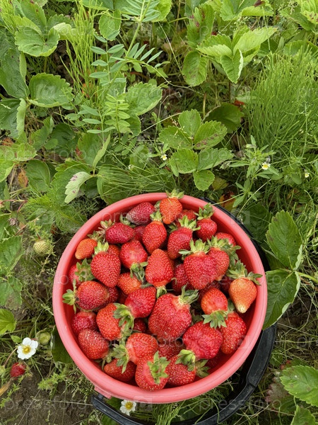 Ведро клубники стоит на клубничном поле