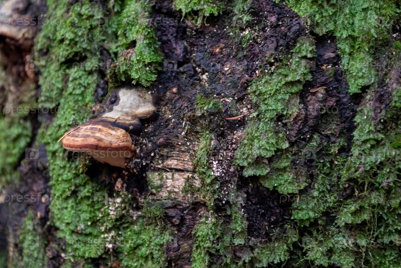 Кора дерева покрыта зеленым мхом и грибом чага крупным планом
