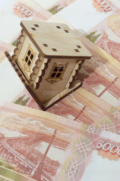 Деревянный дом стоит на крыше с большим количеством купюр номиналом пяты тысяч. Покупка или продажа недвижимости. Оформление ипотеки. Неудачная сделка, обман, мошенничество