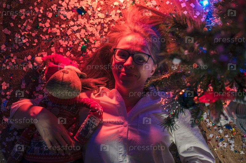 Счастливая улыбающаяся женщина лежит на полу и празднует Новый год