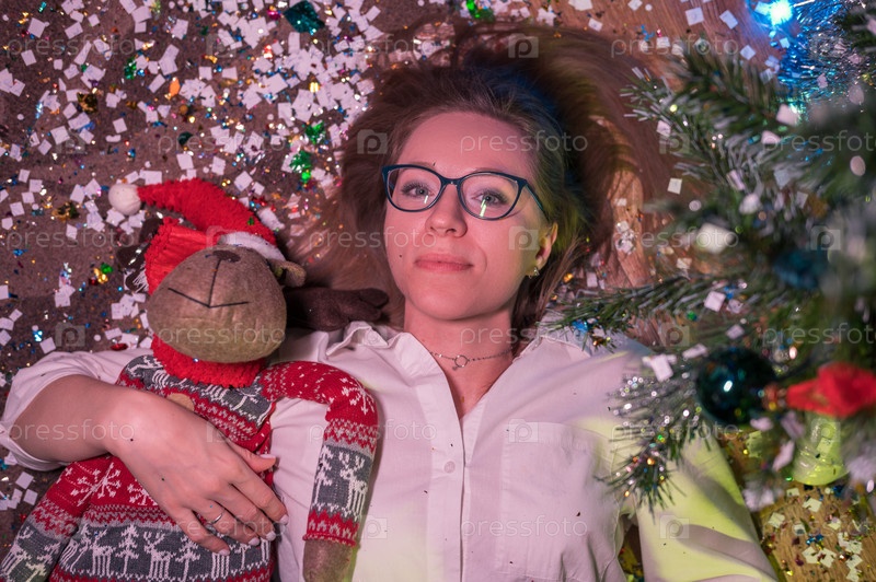 Счастливая улыбающаяся женщина лежит на полу и празднует Новый год