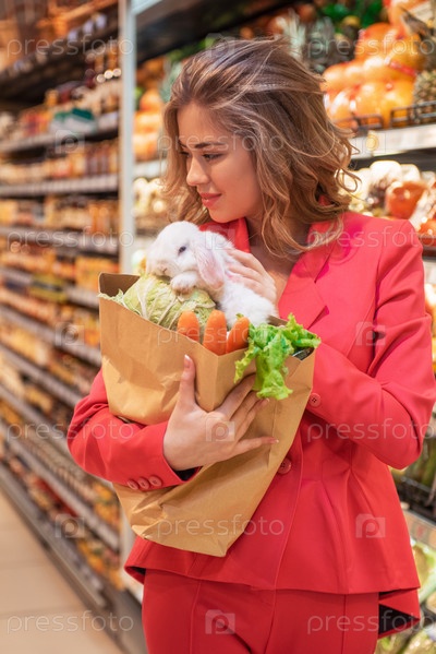Молодая красивая женщина делает покупки в супермаркете, чтобы купить овощи для своего домашнего белого кролика