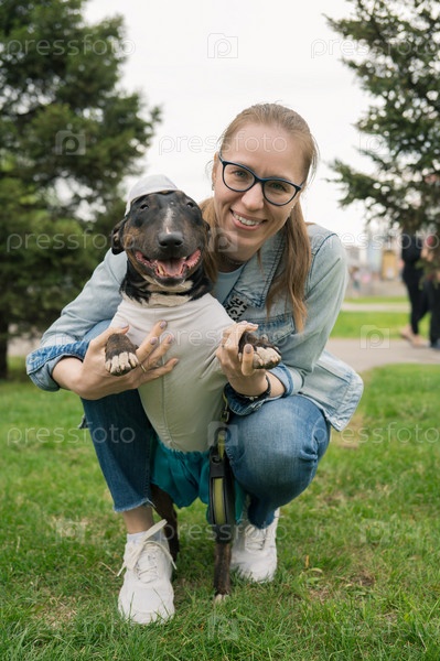 Счастливая женщина гуляет с бультерьером в парке