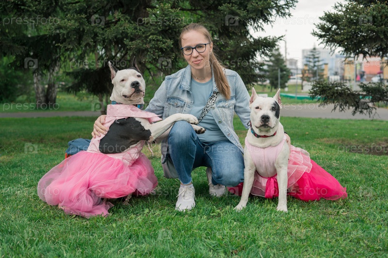 Счастливая женщина гуляет с двумя аргентинскими догами