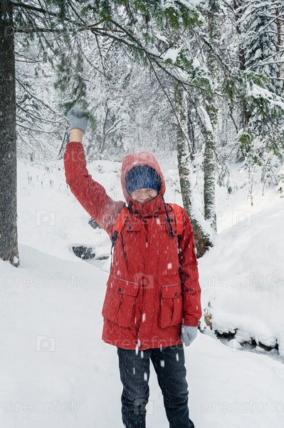 Мальчик гуляет по заснеженному зимнему лесу