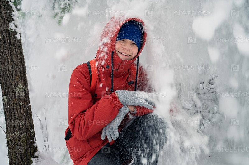 Мальчик гуляет по заснеженному зимнему лесу