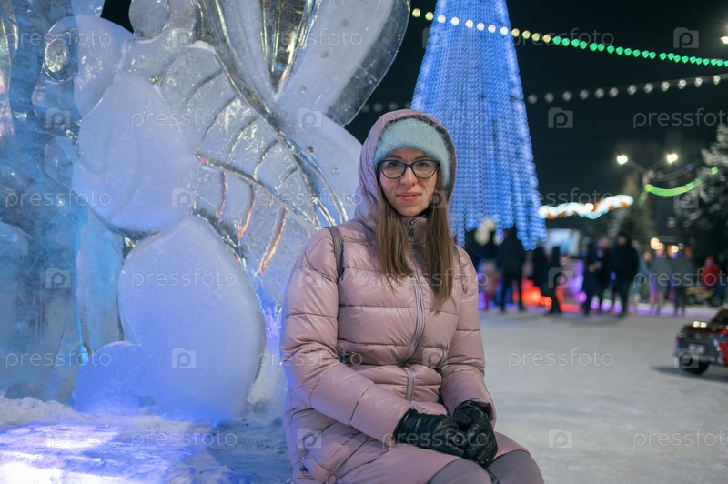 Красивая женщина просыпается в новогоднем ночном городе. Рождественские праздники, Новый год или Рождество