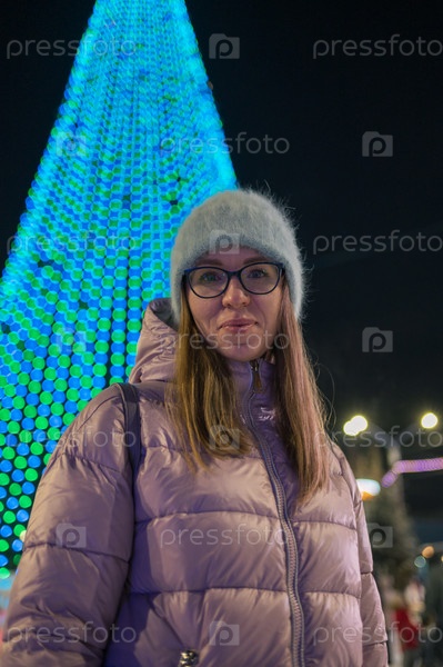 Красивая женщина просыпается в новогоднем ночном городе. Рождественские праздники, Новый год или Рождество