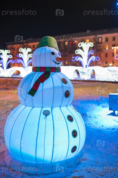 Снеговики, освещенные разноцветными огнями в ночном новогоднем городе