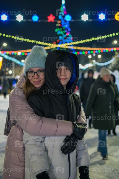 Удивительные моменты праздника: счастливая женщина с сыном позирует на праздничной новогодней улице