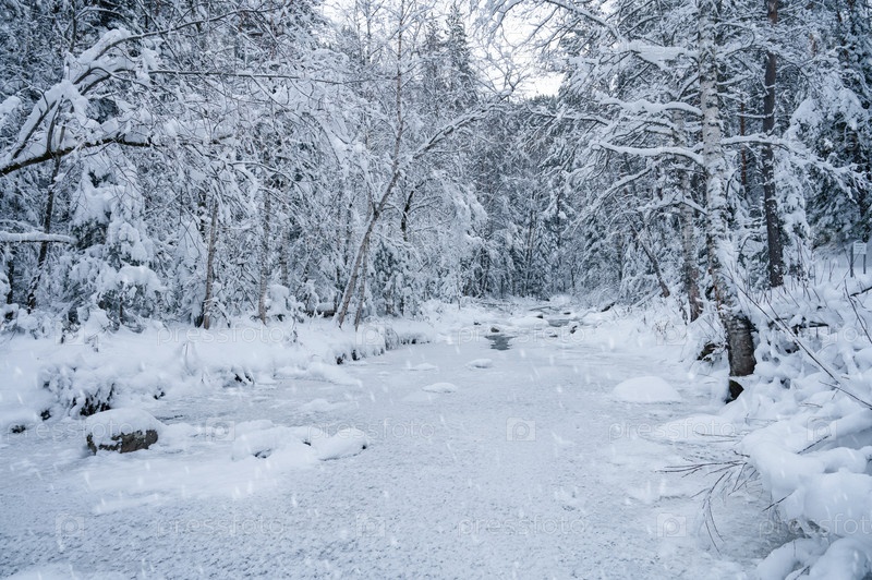 Красота зимнего пейзажа с прекрасными деревьями и рекой под снегом