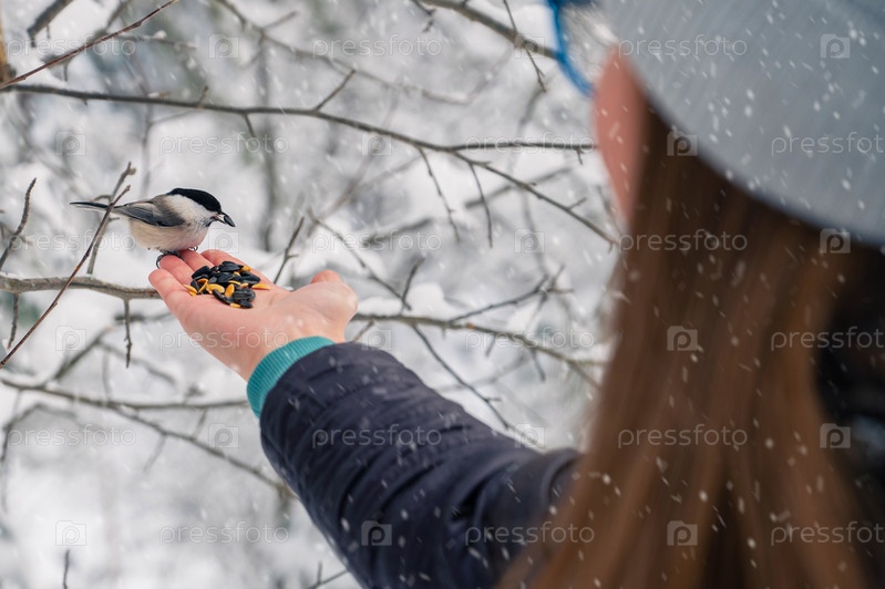 Женщина в зимней куртке кормит птиц