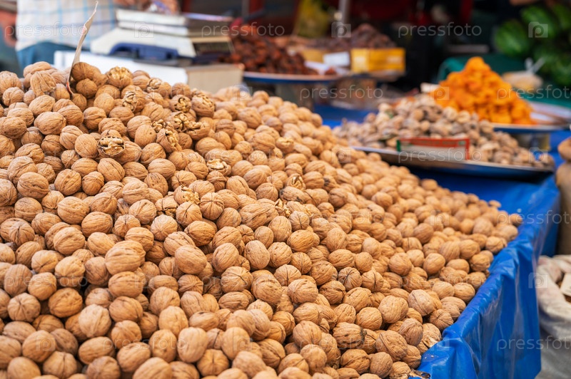 Продажа грецких орехов на традиционном фермерском турецком рынке, прилавок со свежими фруктами