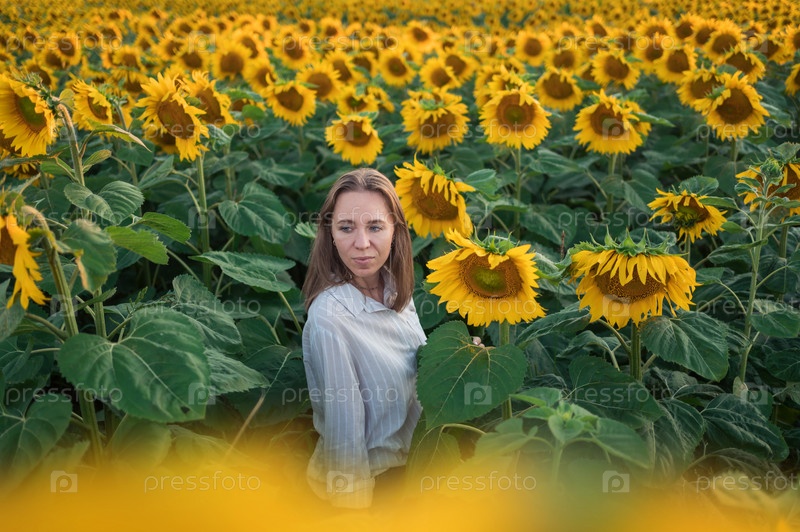 Портрет красивой женщины, позирующей в поле с подсолнухами
