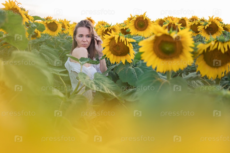 Портрет красивой женщины, позирующей в поле с подсолнухами