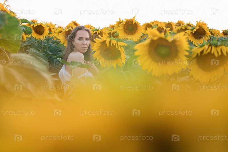 Портрет красивой женщины, позирующей в поле с подсолнухами