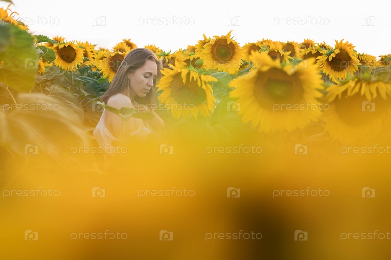 Портрет красивой женщины, позирующей в поле с подсолнухами