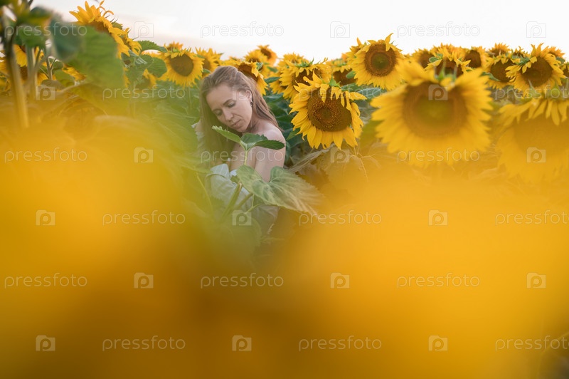 Портрет красивой женщины, позирующей в поле с подсолнухами